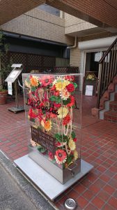 透明のケースの中に花を飾った看板。